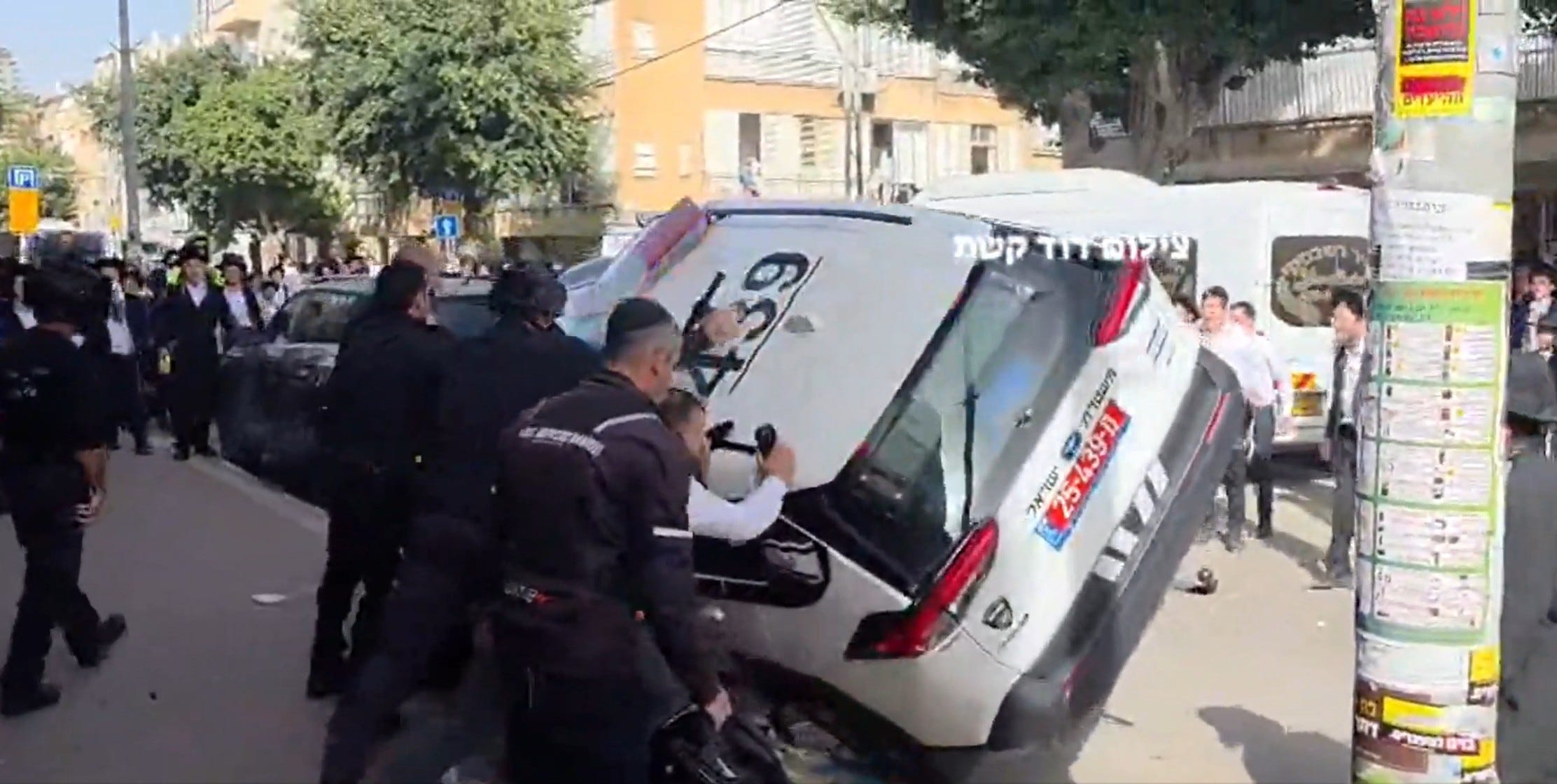 Police flip a police car that was overturned by a violent mob who chased female IDF soldiers and set a police motorcycle on fire, in the ultra-Orthodox city of Bnei Brak on February 15, 2026. (photo credit David Keshet/X)