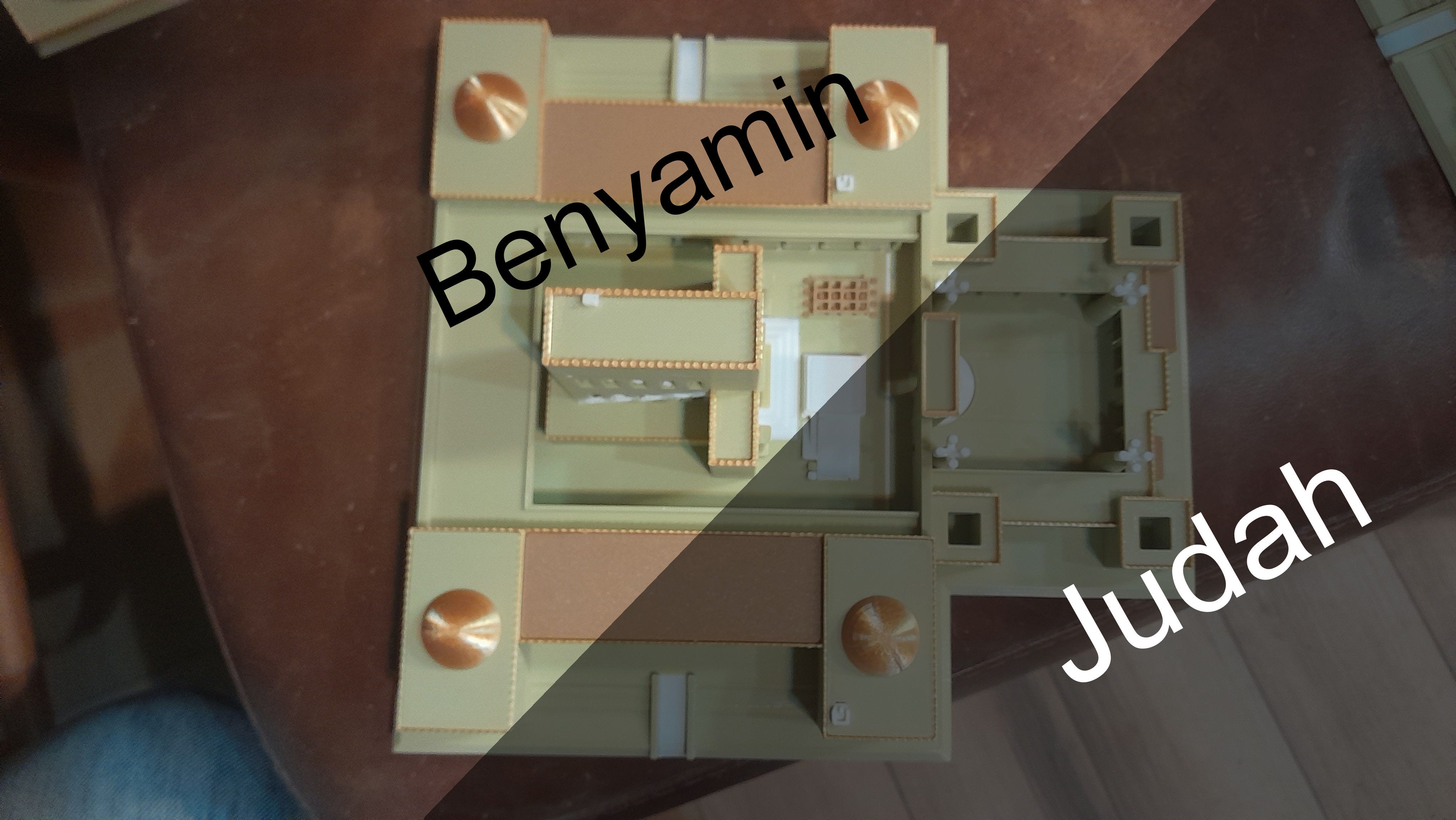 The Temple and 3 of the large corner buildings are located in the Land given to Benyamin. The territories are split diagonal right through the altar with Judah in the shaded area. (Image Yosef Eitan)